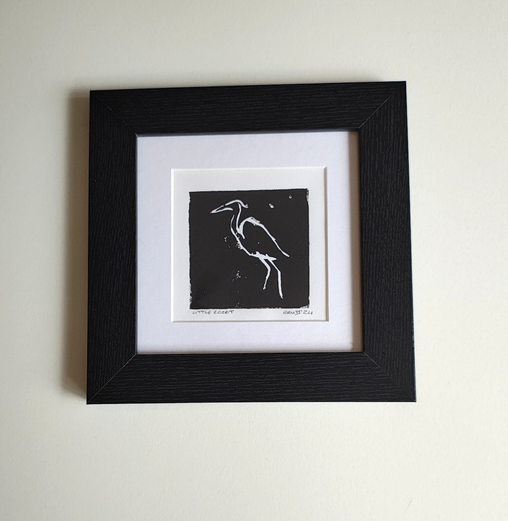 Little Egret Linocut. This little original linocut of mine, ready-framed, is perfect as a gift or an addition to your decoration schemes. Find out more about the inspiration behind it in my Etsy shop.