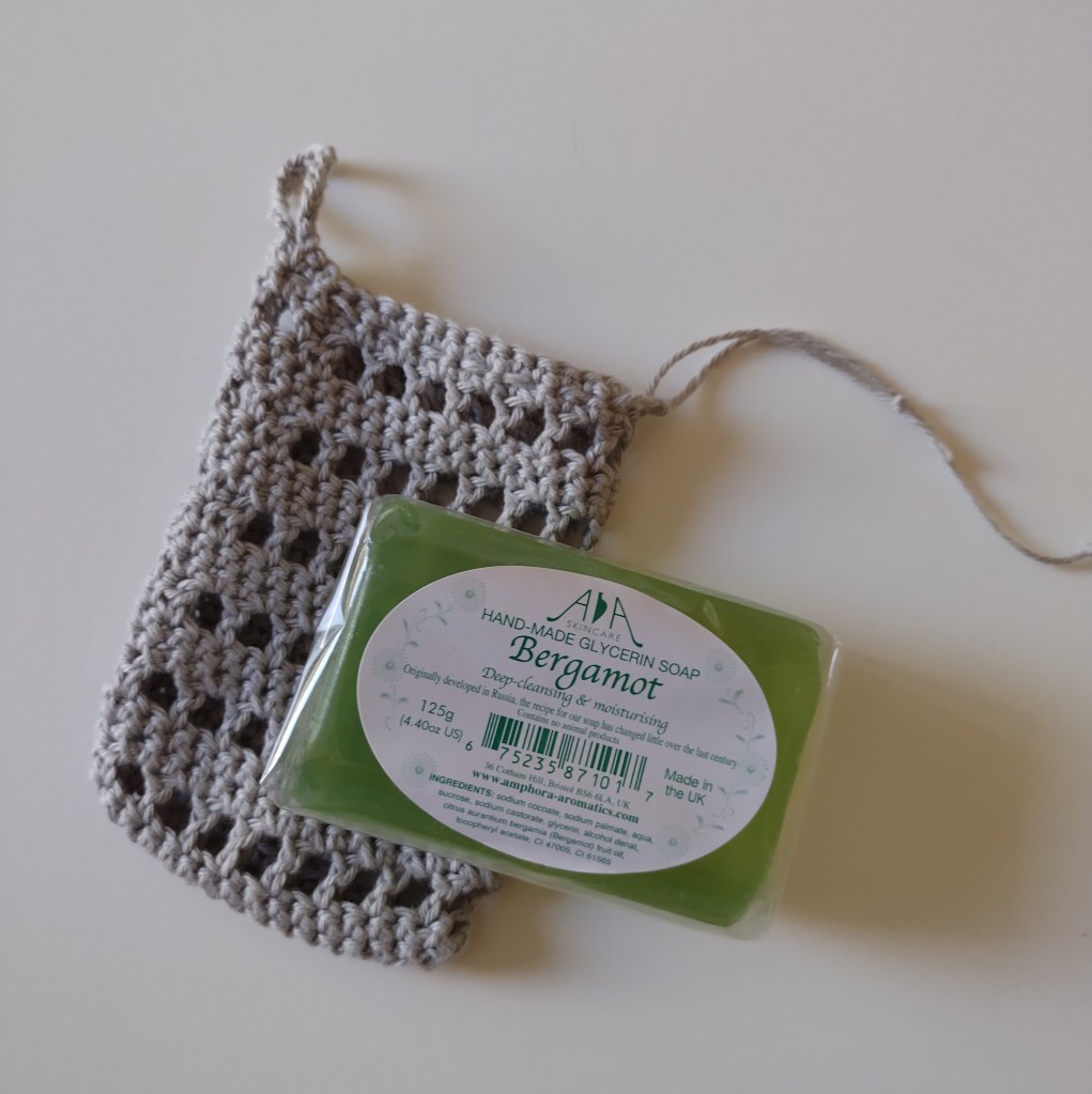 or this handmade soap (sourced in UK) and 100% organic cotton soap-saver I’ve crocheted for your eco-friendly friends: