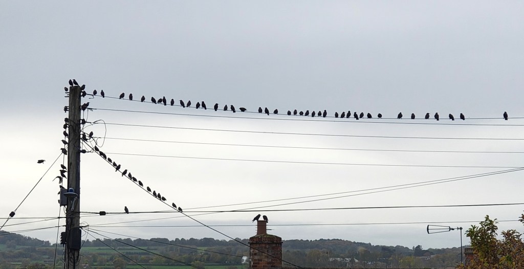 I’ve posted before about my bird haiku book, available here, and during the year I keep writing about the birds I spot, an ongoing project for me. For the last few weeks the starlings have been gathering on the lines in our road, reminding me of that Hitchcock movie classic ‘The Birds’, very appropriate for this week!