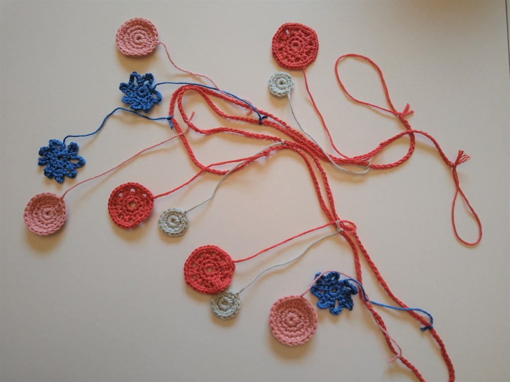Crocheted in four contrasting colours, this pretty garland will brighten up the interior of a room and perfect for a garden party vibe. Made in 100% cotton, featuring flower & circle motifs and measuring approx. 1.5 metres with hanging loops tied at ends. Coral, mid blue, pink and pale green.