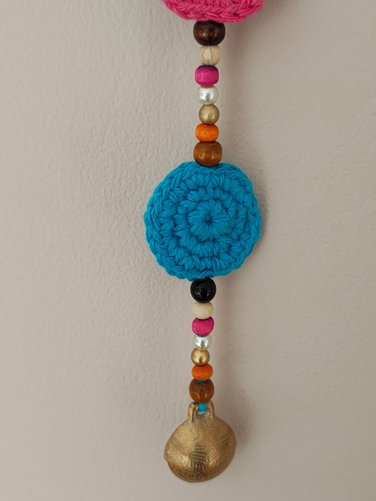 This hanging crochet wall ornament is made from cotton thread, a mix of beads (wooden, plastic, semi-precious – 1 red tigers eye and 4 mookaite and glass) and a small brass bell.