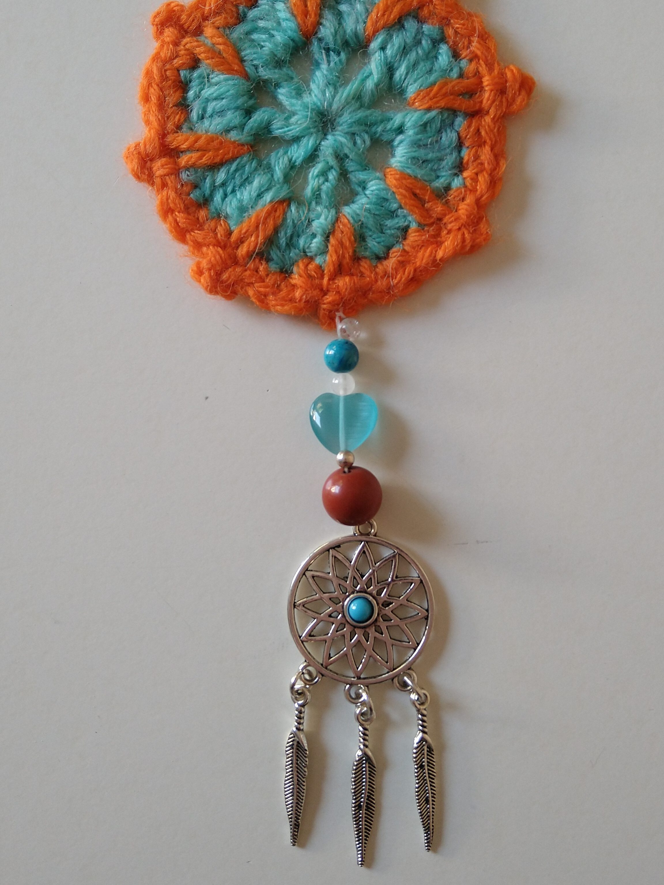 Featuring a dream catcher charm and assorted beads this crochet wool roundel wall hanging is made from wool yarn from the UK.